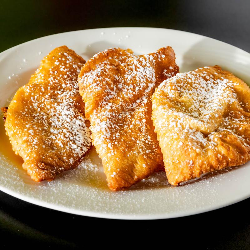 Three pieces. Served with honey yogurt, berries, and maple syrup.